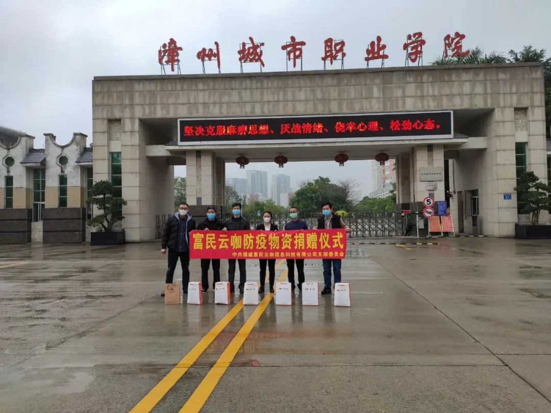 3月4日,我系校企合作企业福建富民云咖信息科技有限公司向我院捐赠防疫物资。当日上午,捐赠仪式在学院东大门举行,学院党委副书记朱镇生,学院副院长林良海,后勤管理处处长曾顺和,经济管理系主任张少华以及福建富民云咖信息科技有限公司副总经理魏丽琴等出席捐赠仪式。